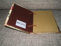 Ruční papír svázaný kůží, desky potažené saténovou látkou s motivem květin.